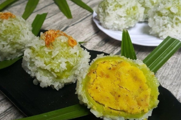 Nếp được lựa chọn thật kỹ, giã cùng lá khúc cho đến khi nhuyễn mịn rồi vo tròn. Lớp nếp xanh bên ngoài sẽ bọc lấy nhân đậu xanh giã, hành phi, mè đen hoà quyện với nhau bên trong. Bánh có thể được hấp hoặc chiên tuỳ theo khẩu vị từng gia đình.