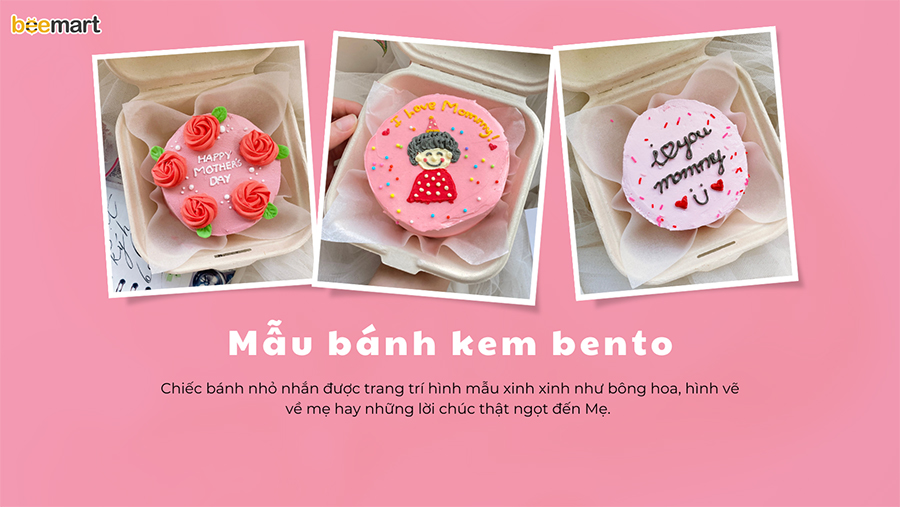 Một sự lựa chọn dành cho các bạn nhỏ muốn dành tặng mẹ món quà xinh xinh nhân ngày của Mẹ. Một chiếc bánh kem bento được tạo hình kute như trang trí hình mẹ, hình gia đình, hình bông hoa hay viết thêm vài dòng chữ tình cảm gửi tới mẹ. Chiếc bánh kem bento tạo hình đơn giản là sự lựa chọn đáng yêu dành cho Mẹ. Bee có gợi ý một vài mẫu câu đơn giản, một vài lời chút tình cảm giúp bạn có món quà ý nghĩa gửi tới Mẹ đó.