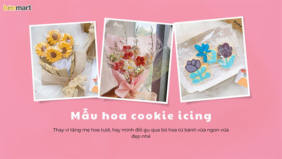 Thay vì một bó hoa tươi đắt tiền, sao mình không đổi gu với bó hoa từ bánh cookie icing cực độc lạ nhỉ. Một mẫu bánh được ưa chuộng nhất hiện nay trong nhiều dịp đặc biệt như sinh nhật, dịp lễ và đặc biệt trong ngày của mẹ, bó hoa cookie icing là một sự lựa chọn siêu ngọt ngào. Bó hoa thường được tạo hình với sắc màu trẻ trung, loại hoa tulip, hoa hồng được ưu tiên dành tặng cho người phụ nữ bạn yêu. Nào cùng chọn mẫu dưới đây và order Bee gửi set nguyên liệu tới bạn cho kịp làm tặng mẹ nhé!