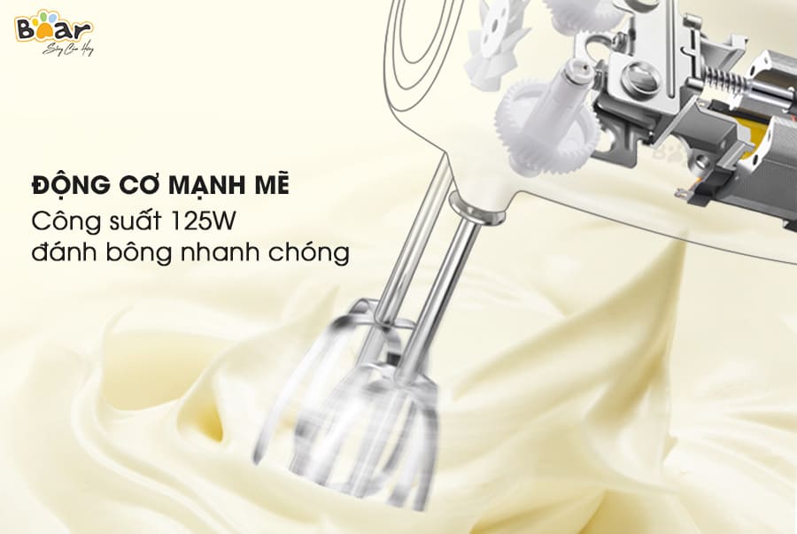 - Với thiết kế nhỏ gọn, thông minh, kết hợp với công suất mạnh 125W tích hợp cùng 5 mức độ đánh khác nhau, máy đánh trứng cầm tay Bear giúp bạn thực hiện thành công đa dạng các công thức bánh ngọt khác nhau, từ bánh bông lan cho đến các loại bánh ngọt, bánh kem, sốt salad,....