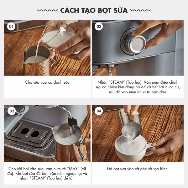 Bên cạnh đó đó máy còn sở hữu ống hơi tạo bọt gắn liền với phần thân máy giúp bạn dễ dàng tạo được lớp bọt kem sữa béo ngậy , hấp dẫn. Nhồ chức năng này của máy mà bạn không chỉ pha được Espresso mà còn có thể thưởng thức thêm Cappuccino, Mocha, Latte,..nữa đó!