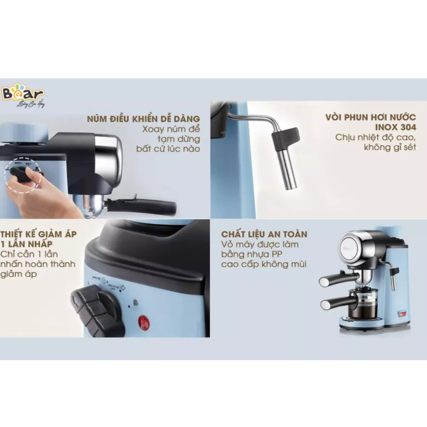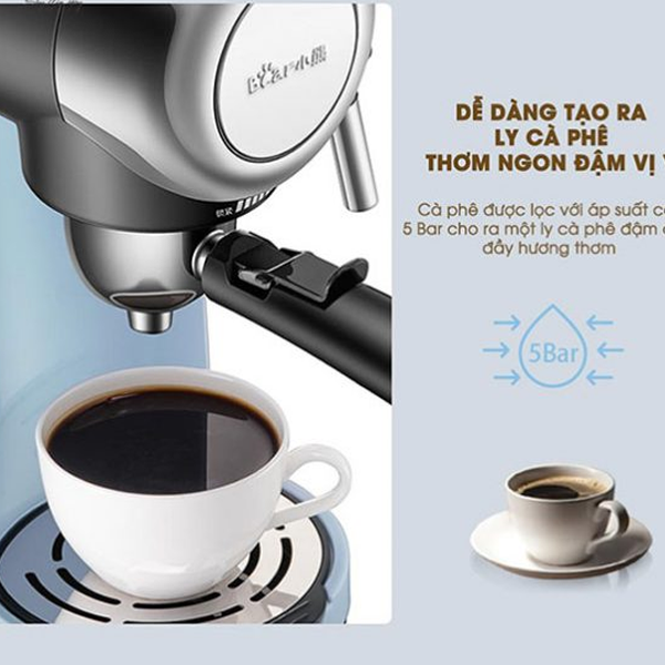 Máy pha cà phê Bear được tích hợp đa nhiều chức năng giúp bạn pha chế được nhiều loại cà phê chuẩn như ngoài hàng. Với mức áp suất 5bar, kết hợp với công suất 800W và nhiệt độ lý tưởng (75 đến 90 độ C) máy pha cà phê Bear sẽ giúp bạn thưởng thức được những ly cà phê nguyên hạt chất lượng ngay tại nhà để khởi động một ngày mới.
