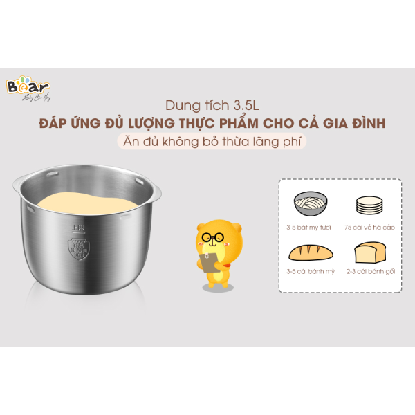 Máy trộn bột Bear có thể trộn từ 300 đến 700 gram bột tương đương với 3-5 vắt mỳ tươi, 3-5 chiếc bánh mì, 2-3 chiếc bánh gối và 75 cái vỏ há cảo,... Định lượng này hoàn toàn phù hợp với gia đình nhỏ, có nhu cầu làm bánh, ăn bánh thường xuyên.