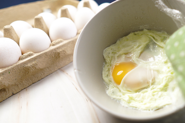 Lưu ý: Cần đảm bảo lòng trắng trứng ngập hoàn toàn trong nước khi đập vào cốc chứa.