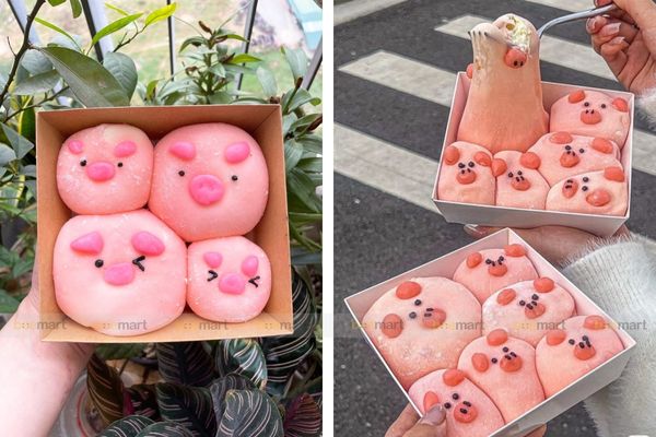 Với màu hồng nhẹ nhàng và hình dáng đáng yêu của chú heo, chiếc bánh mochi này sẽ khiến bất cứ ai nhìn thấy cũng không thể rời mắt. Vỏ bánh mochi mềm mại được tạo hình những chú heo mũm mĩm, khuôn mặt ngộ nghĩnh kết hợp với phần kem vị dâu tây.