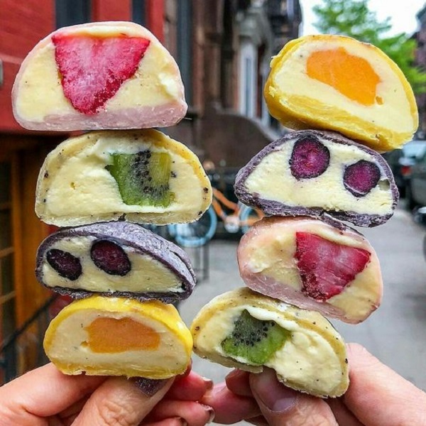 Điểm đặc biệt của mochi này là nhân quả tươi ở giữa kết hợp với phần kem mát lạnh