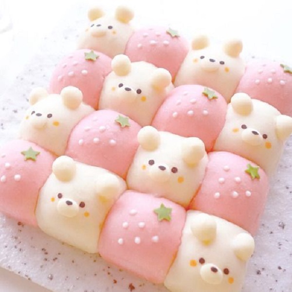 Những viên mochi kem lạnh tạo hình chú gấu trắng hồng xinh xắn, xếp cạnh quả dâu hồng trông núng nính thật đáng yêu. Đó là lý do những hộp bánh mochi kem lạnh tạo hình này thu hút sự chú ý của giới trẻ và gây bão trên cộng đồng mạng.