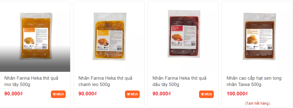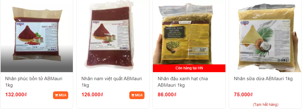 - Nhân sên sẵn trung thu của AB Mauri, nhân Farina,... với cực nhiều vị từ truyền thống (nhân đậu xanh, hạt sen, khoai môn,...) đến vị hiện đại (mè đen, nam việt quất, lá dứa, thịt hoa quả,...) hứa hẹn mang đến những chiếc bánh trung thu đa vị, hấp dẫn hơn.
