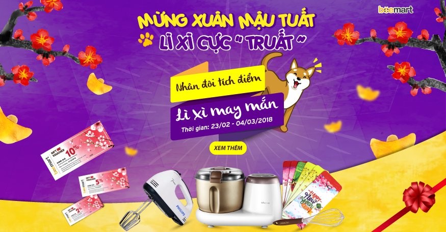 Chúc mừng năm mới 2018, Beemart xin kính chúc tất cả quý khách một năm mới an khang thịnh vượng, vạn sự như ý, phát tài phát lộc. Chào đón xuân mới Mậu Tuất với hàng trăm lì xì cực "truất" sẽ làm món quà may mắn đầu năm Beemart muốn gửi đến tất cả quý khách.