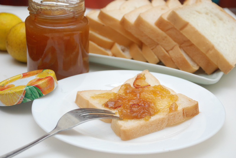 - Bước 1: Bạn dùng dao, phết mứt cam lên mặt bánh sandwich rồi kẹp mặt còn lại vào.
