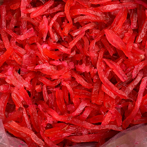 Mứt gừng đỏ được làm từ những củ gừng non, còn nhiều nước, không bị xơ sên cùng với đường và 1 chút màu thực phẩm để phần mứt có màu sắc bắt mắt. Mứt được cắt thành sợi có độ ẩm nhẹ, thơm mùi gừng, kết cấu mềm dẻo, không bị khô. Khi thưởng thức bạn sẽ vẫn giữ nguyên được vị cay nhẹ của gừng thêm một chút ngọt dịu của đường vô cùng hấp dẫn.