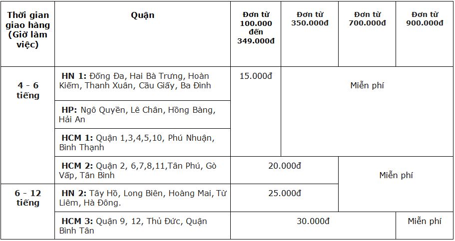 > Đối với các quận, huyện khác của Hà Nội, TP HCM và Hải Phòng cũng như khách tỉnh vẫn áp dụng các chính sách vận chuyển qua ngày hoặc qua xe khách với biểu phí tùy theo khối lượng hàng hóa. Xem chi tiết TẠI ĐÂY.