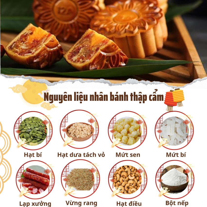 Nhân bánh trung thu thập cẩm là sự kết hợp của nhiều thành phần nguyên liệu khác nhau. Đó là sự hòa quyện của các thành phần truyền thống như lạp xưởng, vừng, lạc, mứt bí, mứt sen... mang lại hương vị thơm ngon cho chiếc bánh Trung thu.
