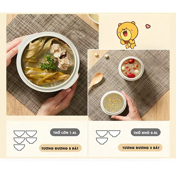 Đặc biệt là nồi nấu cháo chậm của Bear đã sử dụng phương pháp đun hầm cách thủy giúp toàn bộ chất dinh dưỡng trong thức ăn được giữ lại. Nồi nấu chậm Bear 1,6L bao gồm 3 thố sứ( 1 thố dung tích lớn 1,6L và 2 thố 0,5L) kèm theo lồng hấp cho phép bạn nấu nhiều món ăn khác nhau cùng một lúc.