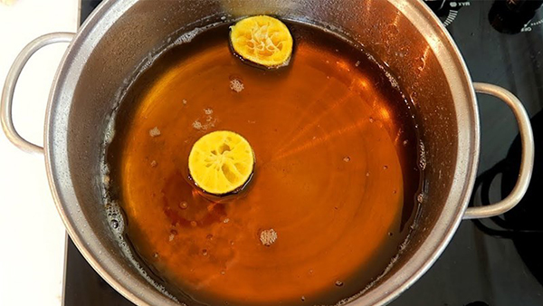 - Bước 4. Cho thêm nước cốt chanh cùng vỏ chanh đã vắt nước vào nồi nước đường. Tiếp tục đun sôi hỗn hợp nước đường với lửa nhỏ từ 50-65 phút.