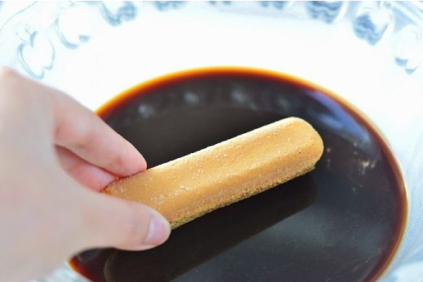 - Nhúng nhanh 2 mặt bánh sampa vào hỗn hợp rượu rồi xếp luôn bánh vào khuôn đã chuẩn bị. Các bạn không nên nhúng lâu hơn 3s bởi sẽ làm bánh sampa bị nhũn, khó có thể xếp bánh vào khuôn. Đồng thời, lớp kem tiramisu sẽ còn ngấm dần vào sampa, các bạn không cần quá lo bánh sẽ bị cứng trong lúc thưởng thức nhé!
