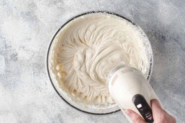Đầu tiên, các bạn sẽ đánh bông mềm kem tươi với đường. Không nên đánh bông cứng, hỗn hợp kem có thể bị tách nước ỏ bước tiếp theo. Trộn thêm mascarpone đến khi có một hỗn hợp đủ đặc. Sau đó thêm 10 ml rượu Rhum để đúng chuẩn bánh Tiramisu nha!