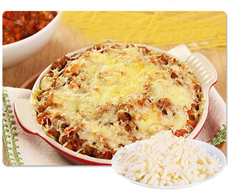 Phô mai được bào sẵn thành các sợi nhỏ, giúp bạn tiết kiệm được thời gian chế biến mà vẫn tạo ra những món ăn thơm ngon và hấp dẫn. Mozzarella là loại phô mai thường sử dụng trong công thức làm các bánh pizza hoặc dùng ăn kèm mì ống, salad,... Bên cạnh đó, phô mai Mozzarella còn góp mặt trong các món khoai tây cuốn tôm phomai chiên ,bánh mì nướng phô mai và pepperoni, bolognese lasagna pasta lá với sốt kem thịt bò, cà tím phomai Mozzarella đút lò,…