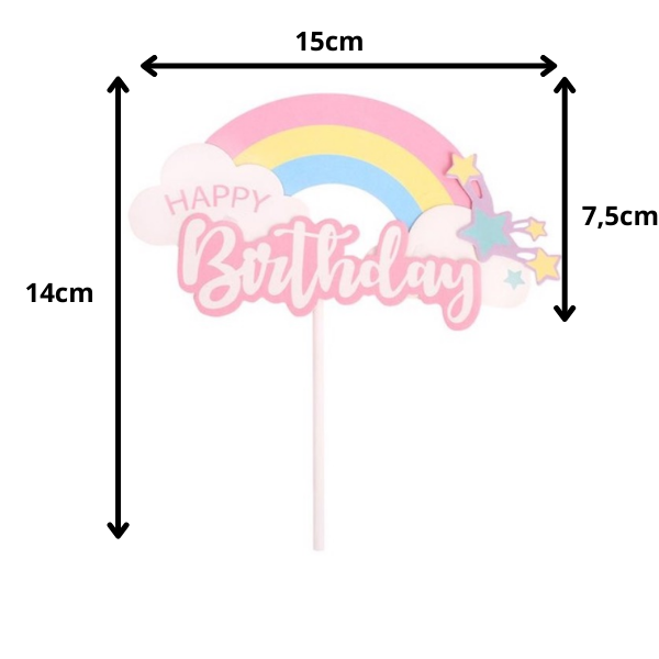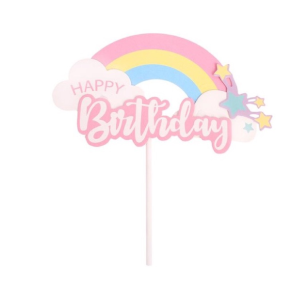 Que cắm HPBD cầu vồng sao hồng gồm phần que cứng cáp, phần chữ Happy Birthday gắn cầu vồng từ bìa cứng, thích hợp cho bữa tiệc sinh nhật của con gái hoặc bé yêu.