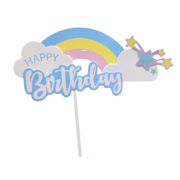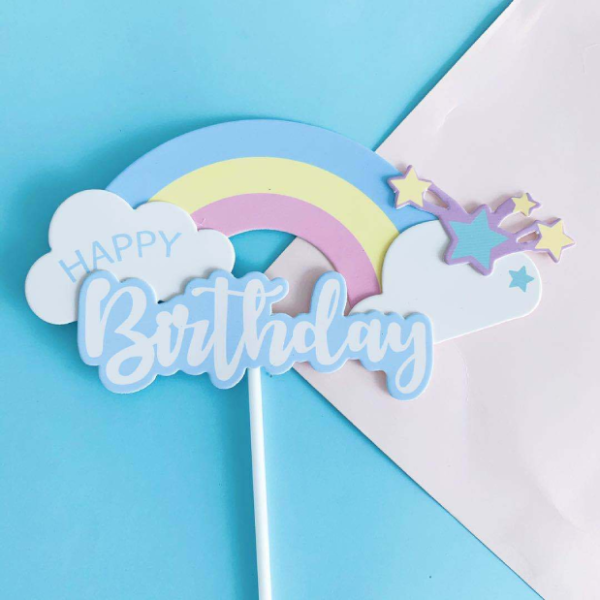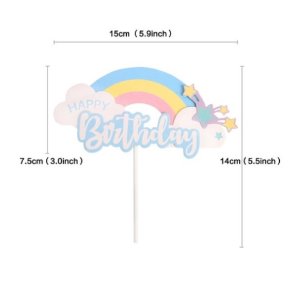 Que cắm HPBD cầu vồng sao hồng gồm phần que cứng cáp, phầnphần chữ Happy Birthday gắn cầu vồng từ bìa cứng, thích hợp cho bữa tiệc sinh nhật của con gái hoặc bé yêu.