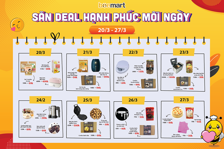 Trong chương trình TUẦN LỄ HẠNH PHÚC này MỖI NGÀY Beemart đều có DEAL sốc cho những đồ làm bánh đang được yêu thích nhất. Bên cạnh đó hàng loạt VOUCHER CỰC LỚN LÊN ĐẾN 50%.