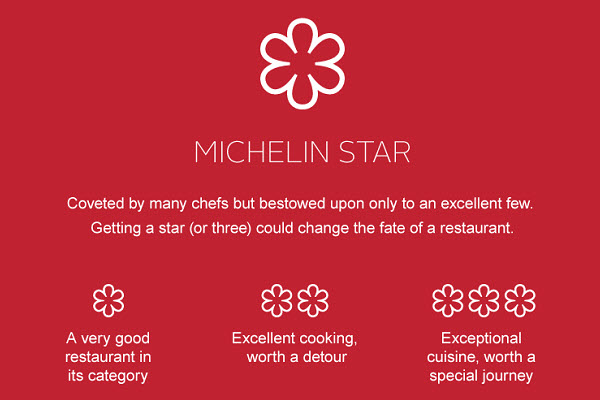 Hệ thống sao Michelin lần đầu tiên xuất hiện vào năm 1926, với một sao duy nhất biểu thị "nhà hàng rất tốt". Ngôi sao thứ hai và thứ ba được thêm vào năm 1933, với hai ngôi sao có nghĩa là "nấu ăn tuyệt vời đáng để quay lại" và ba sao là "ẩm thực ngoại hạng, đáng để thực hiện một hành trình đặc biệt".