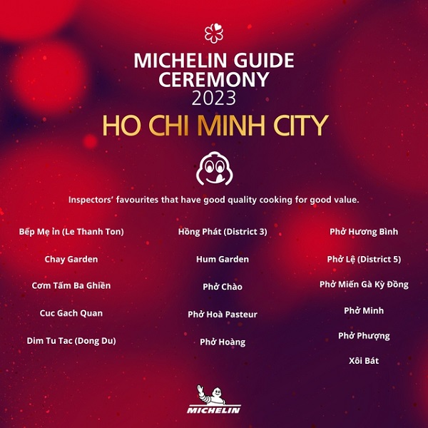 Bên cạnh các nhà hàng được nhận sao danh giá, Michelin cũng công bố kết quả hạng mục Michelin Selected (đạt chuẩn Michelin Guide) gồm 70 nhà hàng. Trong số này có 32 nhà hàng ở Hà Nội và 38 ở TP.HCM. Hạng mục này ghi dấu nhiều nhà hàng, quán ăn đã có tiếng từ lâu như: phở 10 Lý Quốc Sư, phở Tiến, quán ăn Ngon, bánh cuốn Bà Xuân, bún chả Obama (bún chả Hương Liên), chả cá Anh Vũ…