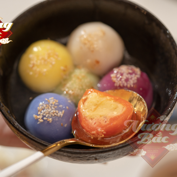 Thành phần: Gạo nếp nương xay ướt, màu củ quả tự nhiên ( Xanh- trà xanh; Tím- lá cẩm, Vàng- Nghệ, Đỏ- gấc ), nhân khoai môn ( viên màu tím ), nhân cốm ( viên màu xanh ), nhân đậu xanh, vừng, bột năng chuyên dụng.