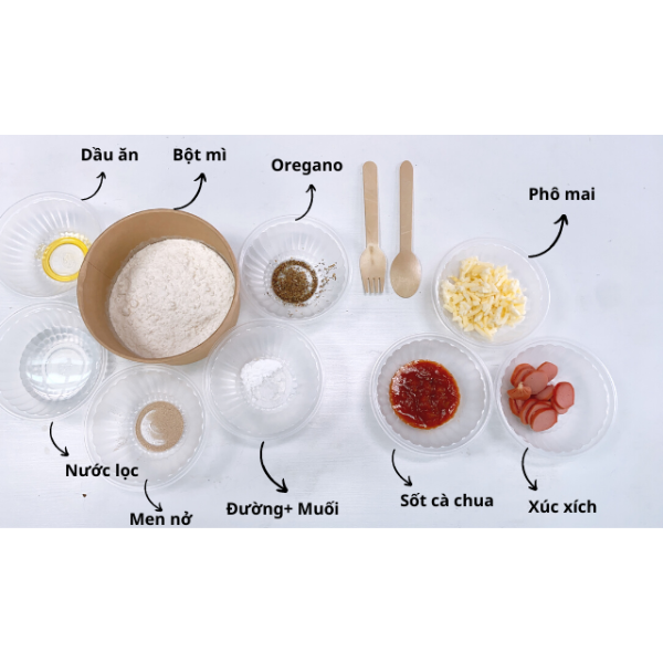 Set nguyên liệu gồm: 100g bột mì; 1g men nở; 2g đường + 1g muối; 2g dầu ăn; 1g oregano; 60g nước lọc; 50g phô mai; 40g sốt cà chua; 50g xúc xích
