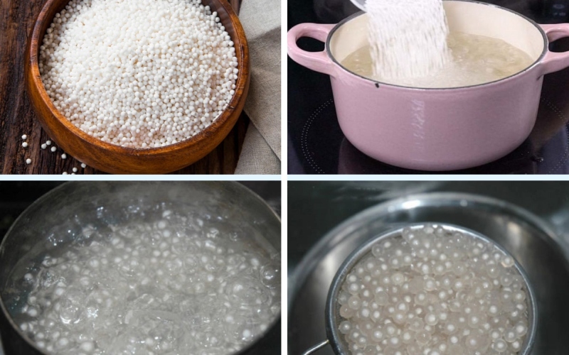 Đun sôi từ 500-600ml nước, sau đó cho 50g hạt sago vào nấu khoảng 15 - 20 phút trên lửa vừa, đến khi hạt sago trong lại và nổi lên trên bề mặt thì vớt ra cho vào tô nước lạnh ngâm để các hạt không bị dính.