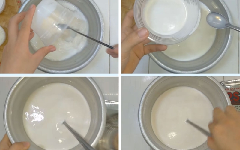 Cho vào nồi mới 50gr đường + 220ml sữa tươi không đường + 50g bột cốt dừa + 100ml nước.