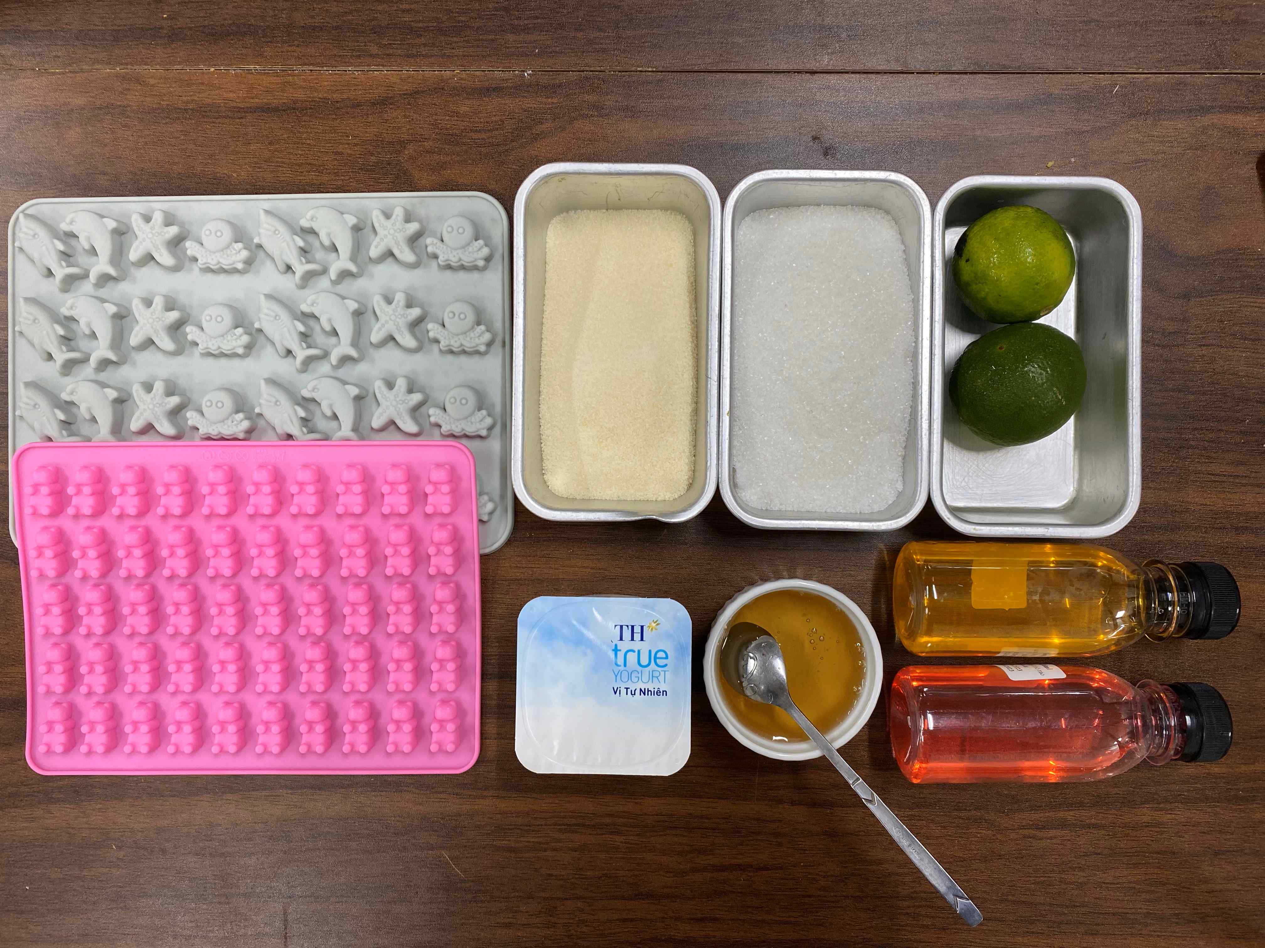 Set nguyên liệu gồm có: bột gelatin, đường, mật ngô, nước cốt chanh, siro tạo vị.