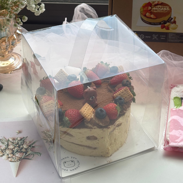 - Thành phần: Whipping cream, Mascarpone, bánh sampa, cà phê đen, rượu Rhum, bột cacao, miếng mica cuốn bánh