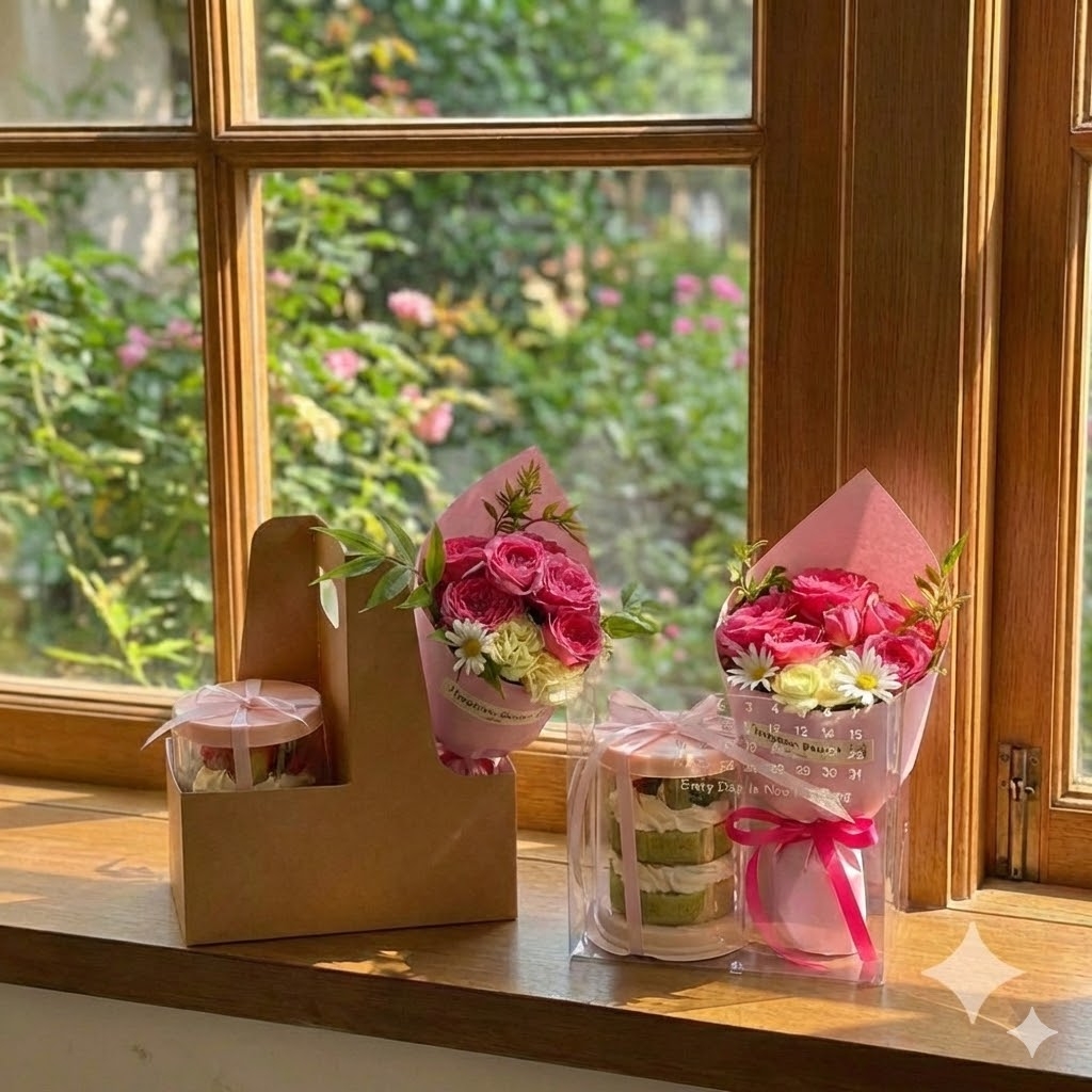 - Giỏ xách kraft: 1 bánh mousse và bó hoa tươi, giỏ xách kraft tinh tế, thiệp, thìa