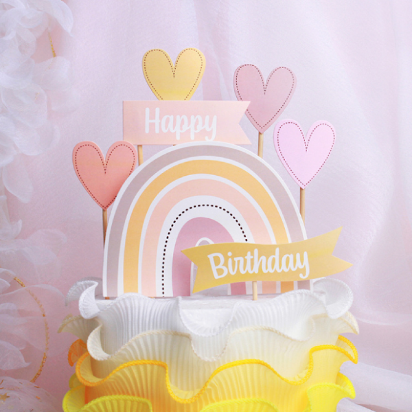 Set que cắm HPBD cầu vồng tim vàng gồm phần que cứng cáp, phần hình cầu vồng, trái tim và chữ happy birthday làm từ bìa cứng bắt mắt, thích hợp cho bữa tiệc sinh nhật của con gái hoặc bé yêu.