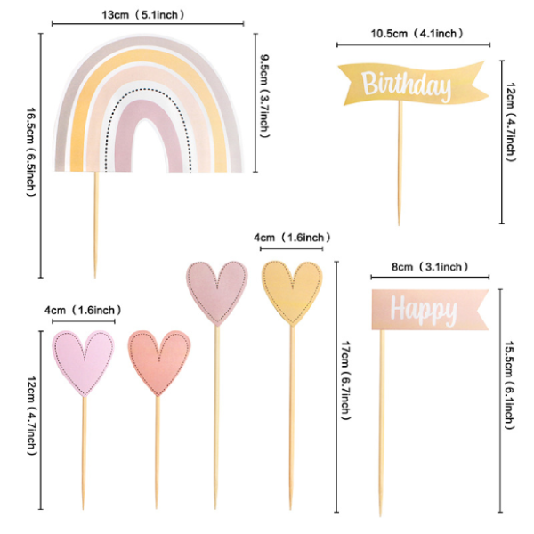 1 set gồm: 1 que cầu vồng, 1 que chữ happy, 1 que chữ birthday, 2 que trái tim dài và 2 que trái tim ngắn
