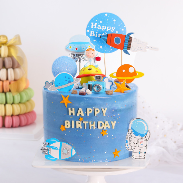 Set que cắm HPBD vũ trụ xanh gồm phần que cứng cáp, gồm phần chữ Happy Birrthday, ngôi sao, vũ trụ, phi hành gia, tàu vũ trụ, thích hợp cho bữa tiệc sinh nhật của các bé trai..