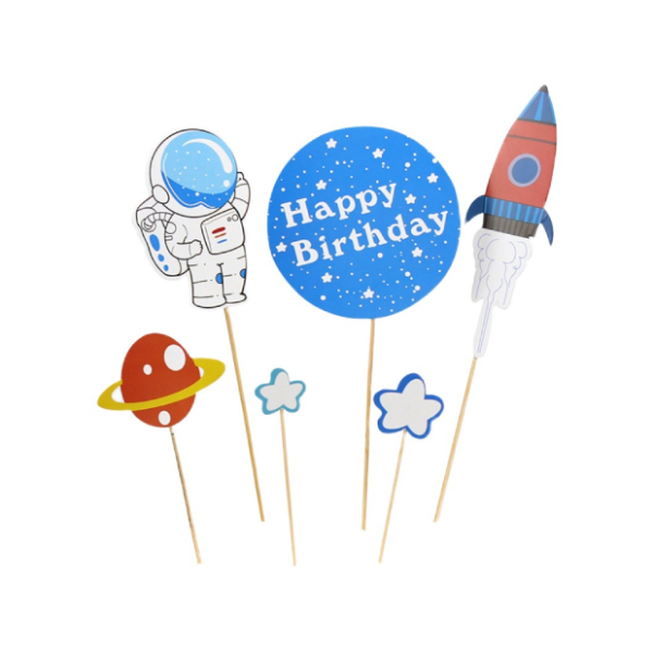 1 set gồm: 1 que cắm Happy Birthday, 2 que ngôi sao, 1 que phi hành gia, 1 que vũ trụ, 1 que tàu vũ trụ