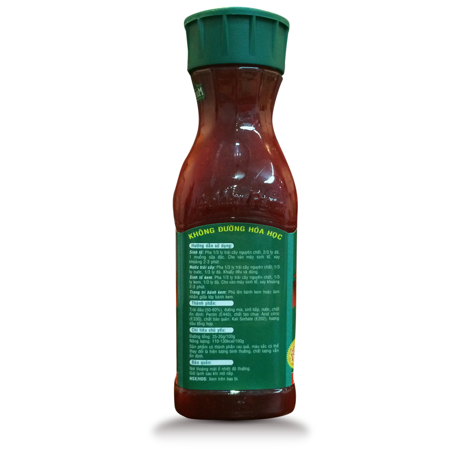 - Thành phần: Trái dâu (50%), đường mía, siro bắp, nước, hương dâu tổng hợp,....