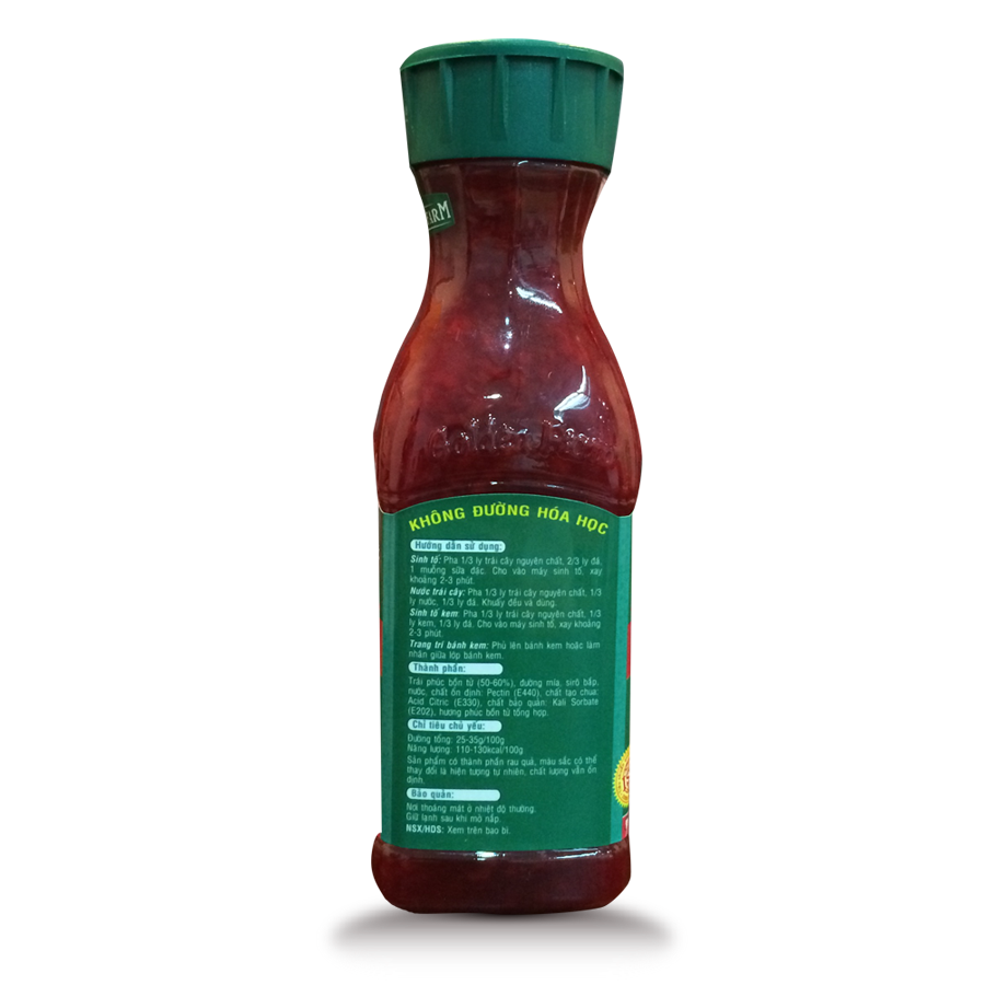 - Thành phần: Trái phúc bồn tử (50%), đường mía, siro bắp, nước, hương phúc bồn tử tổng hợp,....