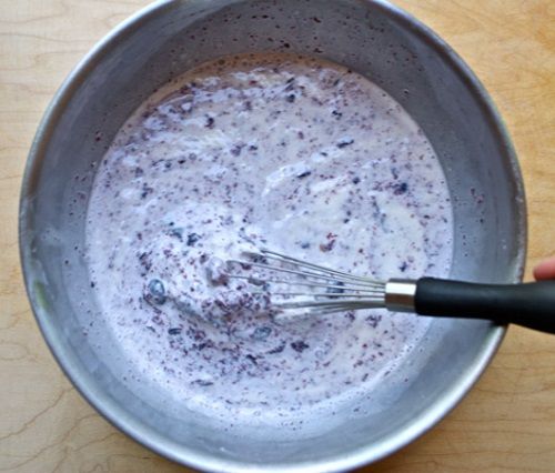 Bước 3: Trộn phần hỗn hợp việt quất sữa chua vào âu kem. Có thể dùng máy hay trộn bằng tay đều được nhưng tốt nhất nên trộn bằng tay để tránh hỗn hợp kem bị đánh quá sẽ xảy ra hiện tượng tách nước.