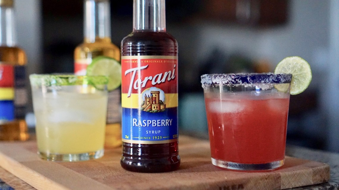 - Thêm siro dâu Torani và siro phúc bồn tử Torani.