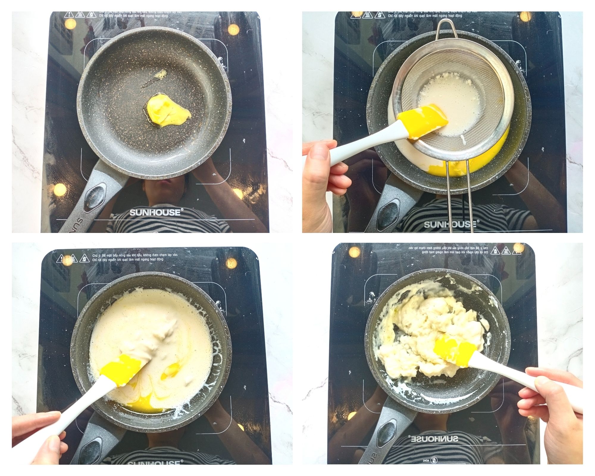-Cách 1 : Đổ hỗn hợp ở bước 2 vào chảo chống dính, cho bơ vào, vừa đun, vừa khấy liên tục