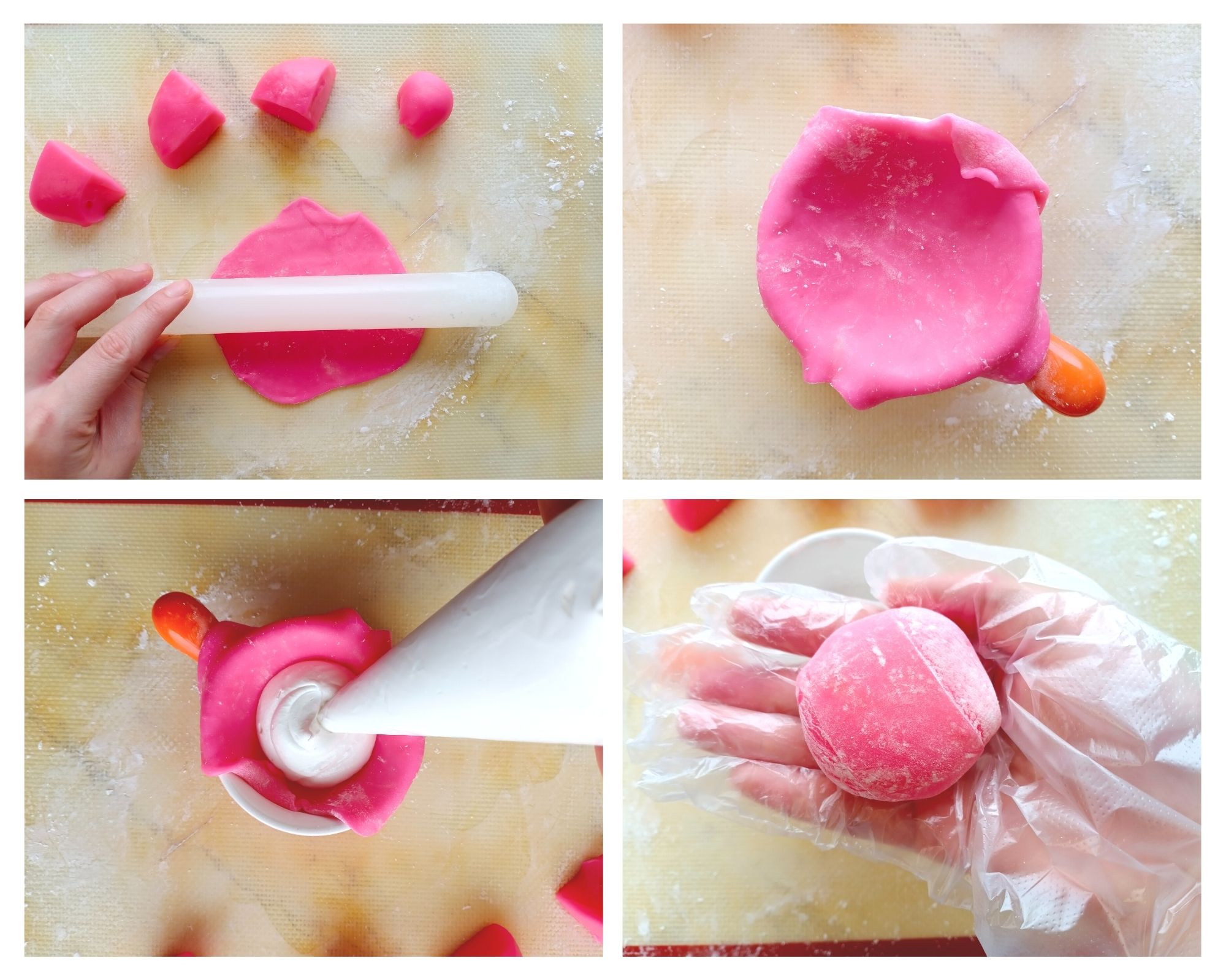 - Lúc này mới lấy phần kem đã làm ở bước 1 trong tủ lạnh ra, bơm vào giữa miếng bột rồi nhanh tay túm các phần bột lại với nhau. Lưu ý miết chặt khi túm bột để kem không bị lọt ra ngoài. Sau đó úp ngược miếng kem mochi lại là bạn đã có miếng mochi hồng nhân kem rùi đó.
