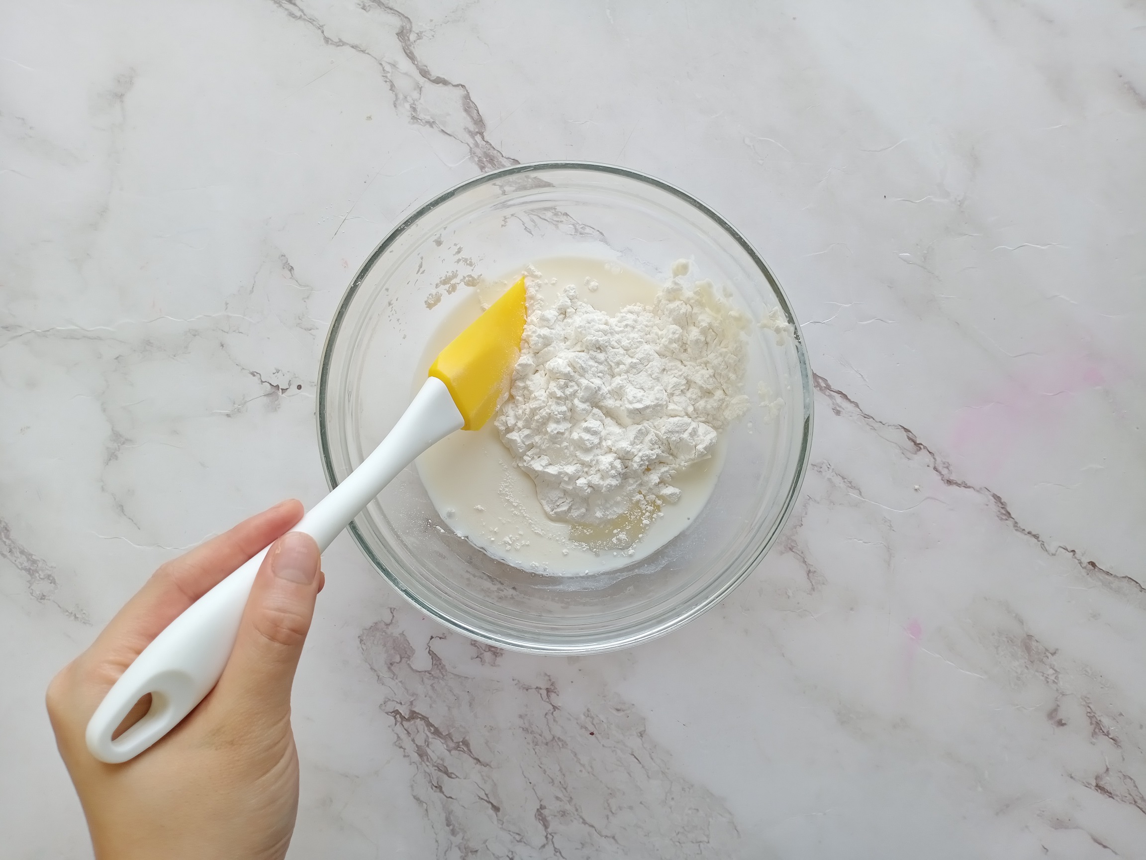 - Cho 50g bột nếp + 10g bột ngô +10g đường + 10g mật ngô + 80ml sữa cho vào một âu