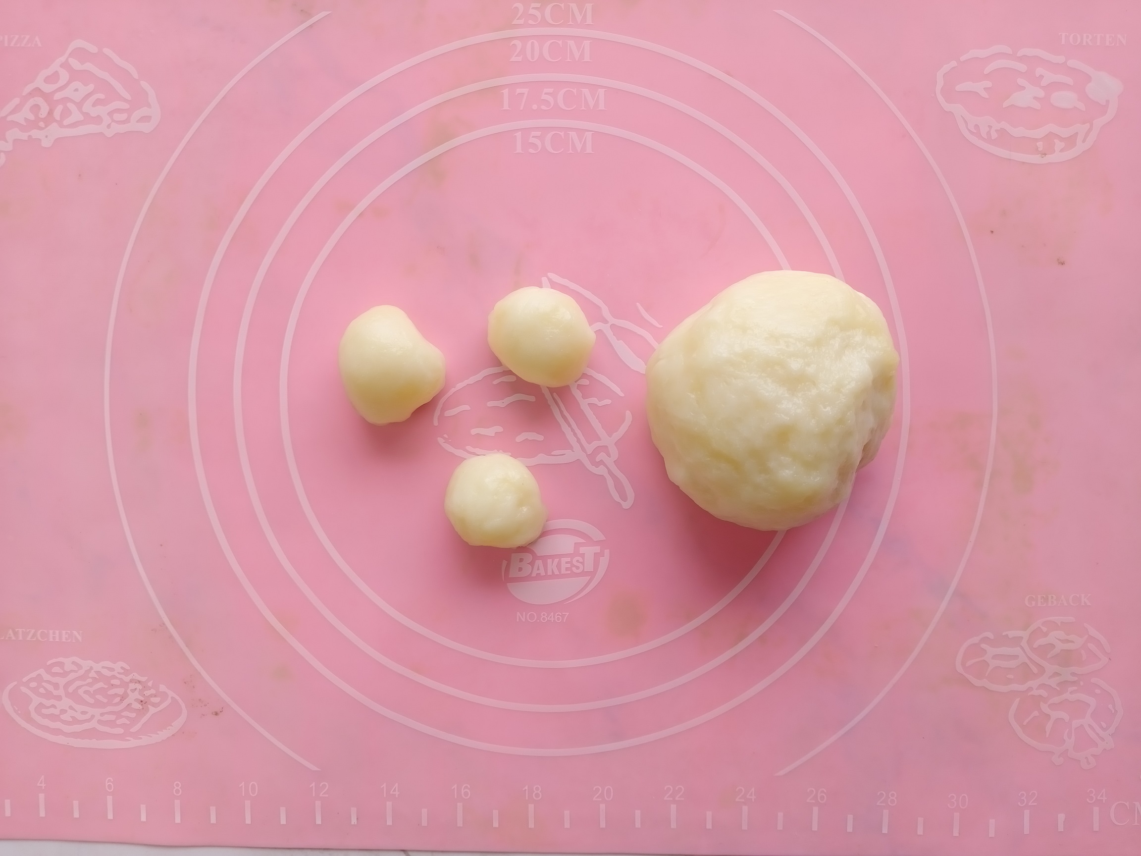 Mochi sẽ chia làm 4 phần: 3 phần nhỏ bằng nhau khoảng 10g/viên, 1 phần to là phần còn lại (như hình)