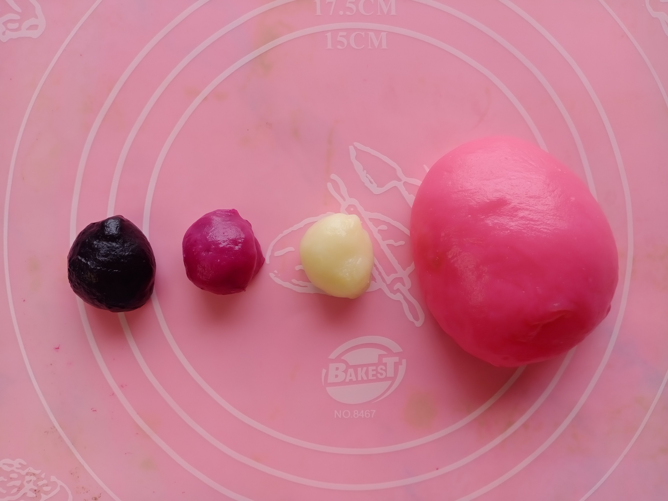 - Viên màu hồng đậm dùng để làm tai và lỗ mũi gấu. Chia bột thành 12 phần sau đó vê tròn. Lấy 4 viên tròn đặt vào giữa phần mũi trắng vừa gắn để làm lỗ mũi gấu. 8 viên tròn còn lại ấn dẹt và đặt lên 2 bên của miếng mochi làm tai gấu.