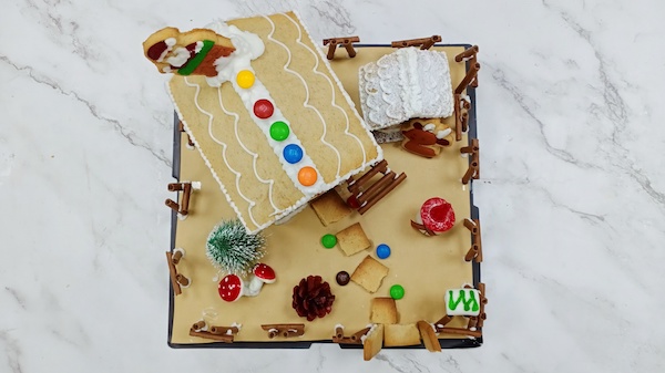 Ngôi nhà được làm chủ yếu bằng bánh quy gừng, gắn với nhau bởi lớp đường icing trắng như những bông tuyết, ngôi nhà có cây, hoa, hàng rào, ống khói,....xung quanh, tạo nên một khung cảnh ấm cúng như trong truyện cổ tích.