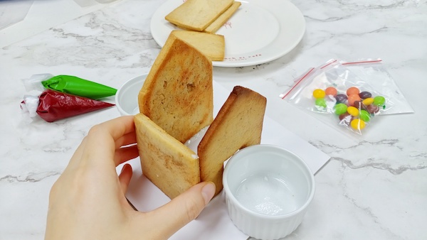 Bước 3: Lắp ráp các bức tường nhà gắn bằng đường icing để dựng khung nhà, sau đó dựng mái
