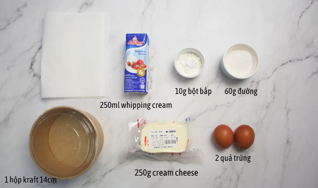 Thành phần: 250g cream cheese, 250g whipping cream, 60g đường, 10g bột bắp, 2 quả trứng, 1 hộp kraft 1000ml, 2 tờ giấy nến